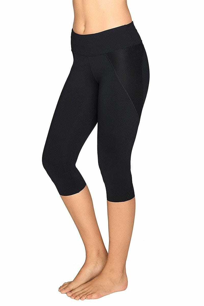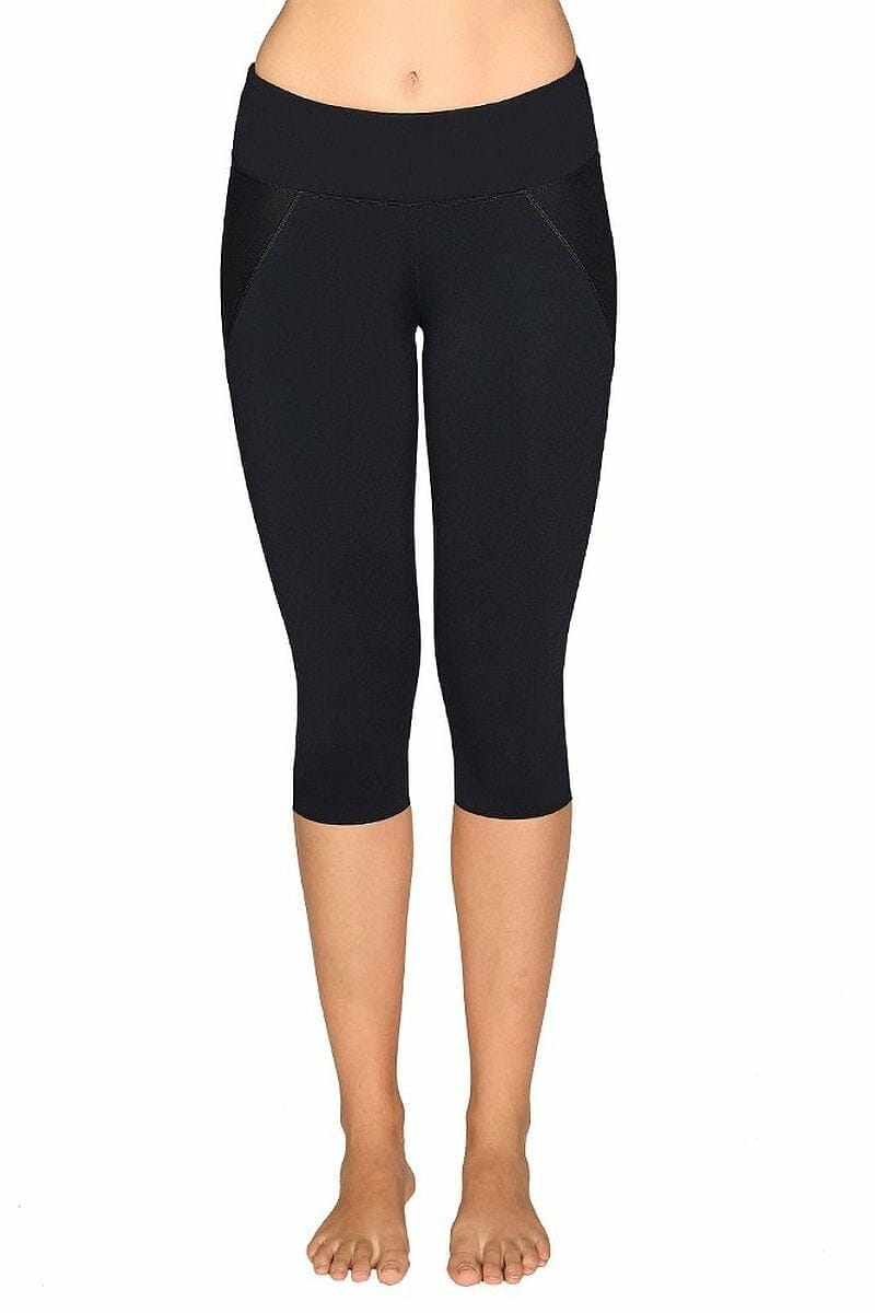 The Amour 3/4 Tight by abi and joseph features a higher rise for modesty, wide waistband with drawcord and performance mesh panelling through the leg to provide firm support while shaping the thighs and hips.