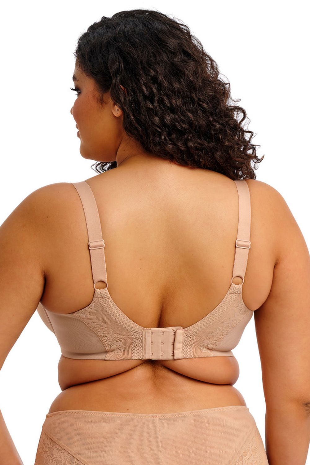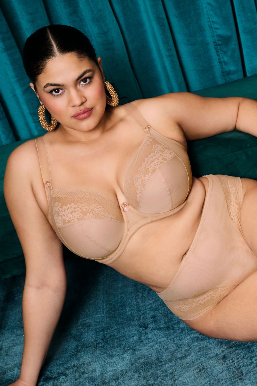 “The plunge centre suits lower necklines, while the stretch lace top cup adapts comfortably to your shape. This bra generally follows Elomi sizing and fits generously in both the cup and back. I recommend sizing down in the band and cup. For example, if you usually wear an 18F, try a 16F in the Nerina Stretch Plunge Bra.” – Amy