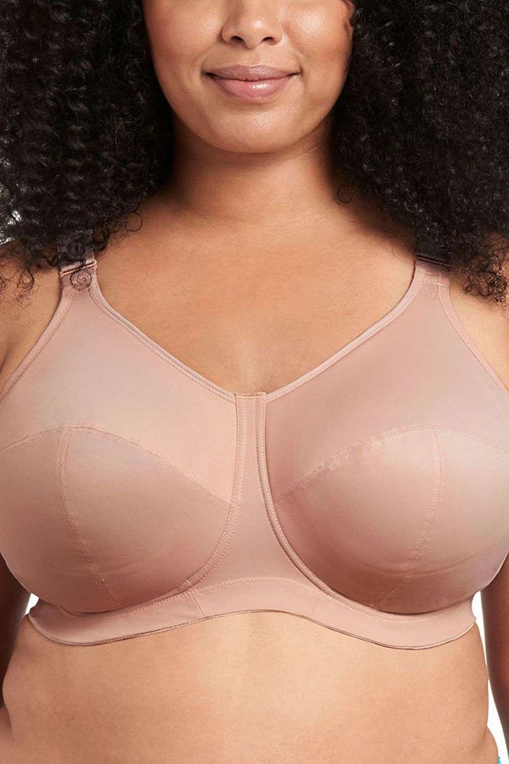 “This bra fits true to Goddess sizing and runs generous in both the cup and back. If you’re new to Goddess, we recommend sizing down in both. For example, if you usually wear a 18G, try an 16G in the Goddess Celeste. The wire-free design provides supportive shaping with comfortable coverage.” – Amy