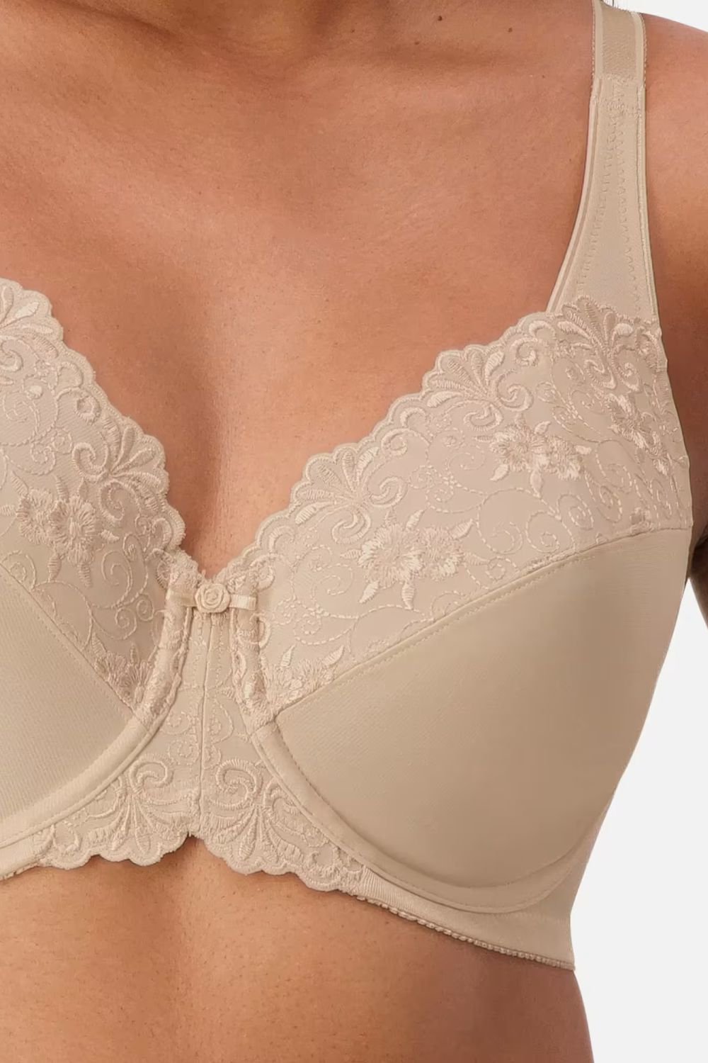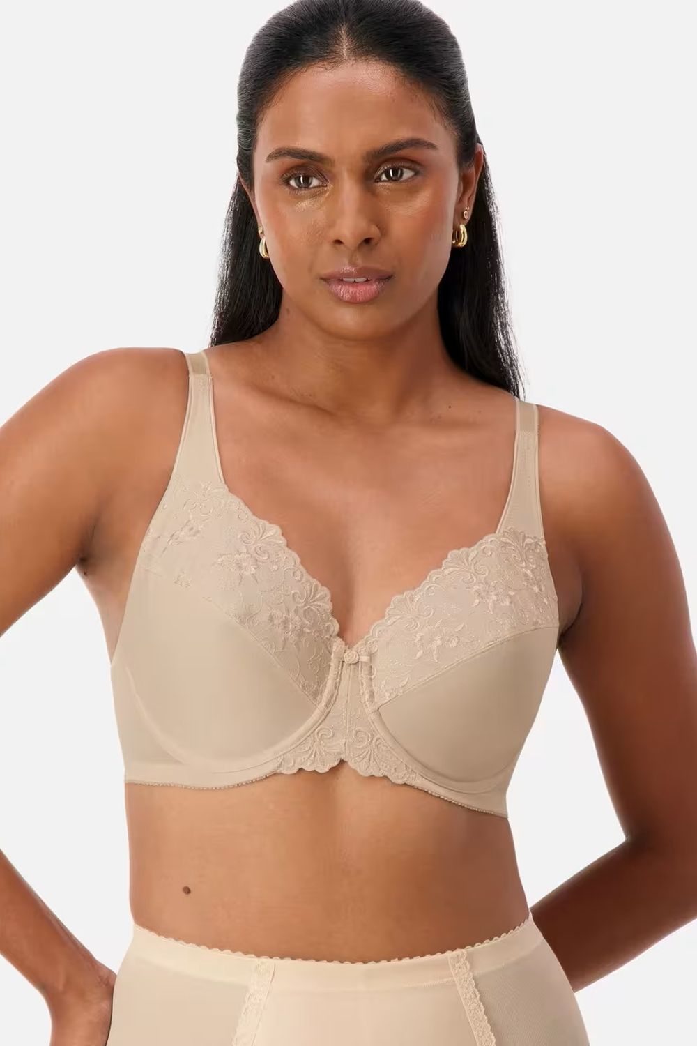 The Embroidered Minimiser Bra is perfect for D-G cups wanting to reduce bust appearance by a cup size.